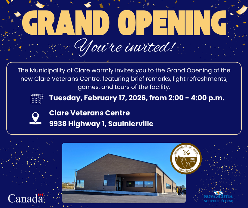 Le Centre des anciens combattants de Clare est enfin prêt à ouvrir officiellement ses portes! Nous vous invitons à vous joindre à nous pour la grande ouverture qui aura lieu le mardi 17 février, de 14h à 16h.