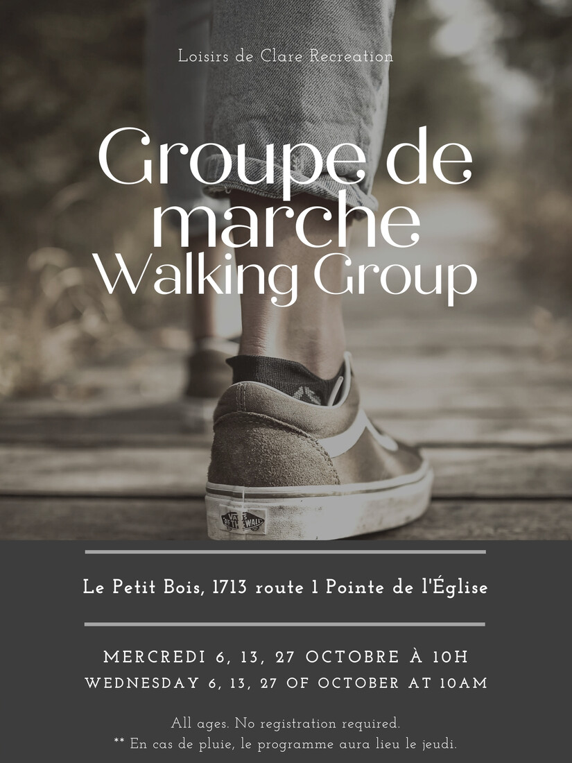 Le service des loisirs de Clare proposera un programme de marche les mercredis du mois d'octobre! Nous allons nous rencontrer à l'Église de la Pointe pour marcher dans le Petit Bois. (1713 route 1). Tous les âges sont les bienvenus.